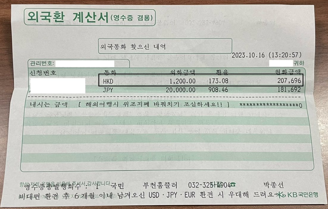 참고로 아래는 한국에서 미리 국민은행을 통해 환전한 내역입니다.