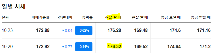 당일 네이버 고시 환율입니다. 한국 환전 환율과 비교하면 나쁘지 않네요.