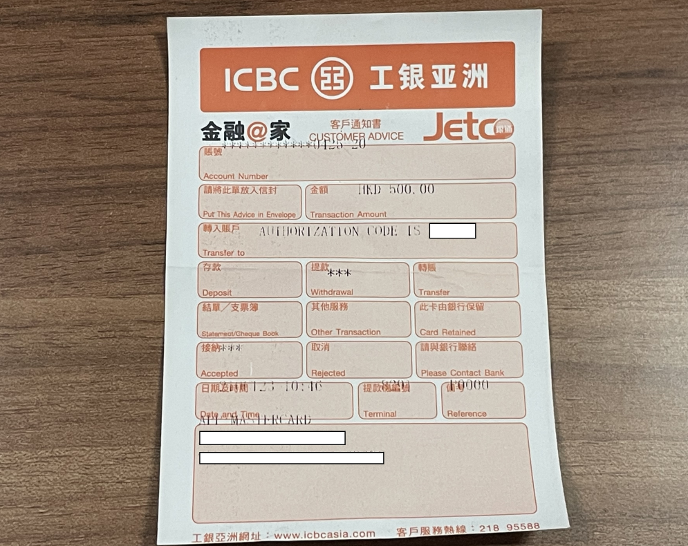 출금 금액은 홍콩달러 HKD500입니다. 홍콩 ATM 은행은 ICBC입니다.