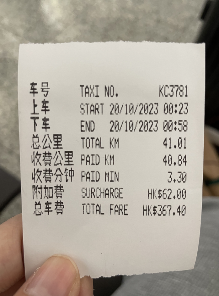 아래 영수증은 실제로 지급한 금액입니다. 서차지까지 367.4 홍콩달러를 현금으로 지불하였습니다.