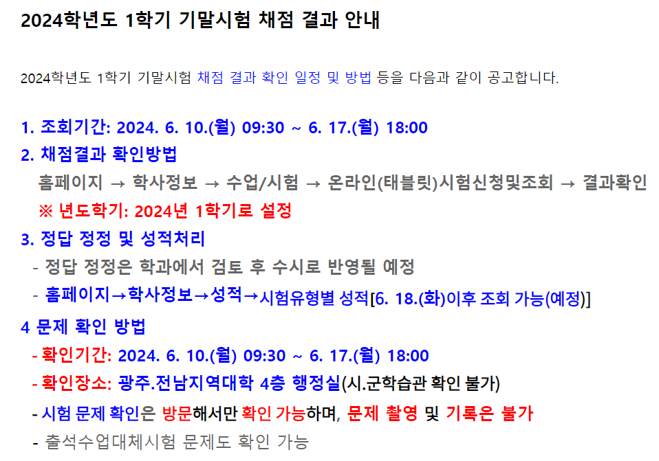 시험성적 확인 모든 기말고사가 끝난 후 홈페이지에서 확인 가능 합니다. 올해는 6월10일부터 조회할 수 있습니다.