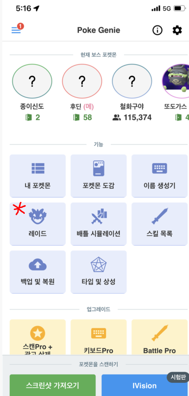 포케지니 어플의 중간 레이드를 누릅니다.