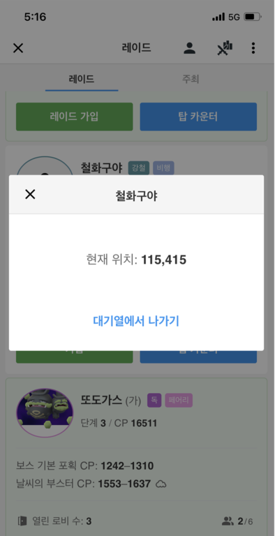 그러면 현재 전 세계에서 진행 중인 레이드 목록이 쭉 뜨는데 그중 철화구야의 가입 버튼을 누릅니다.